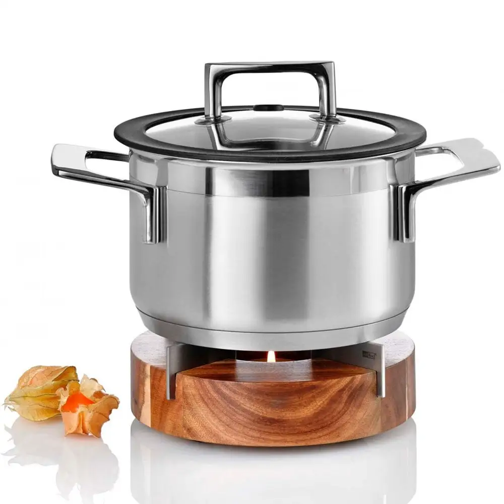 Värmaren är gjord av akaciaträ utrustad med fyra rostfria element. Behållaren du vill hålla varm ställs på den – liten gryta, en soppskål eller en tekanna, till exempel