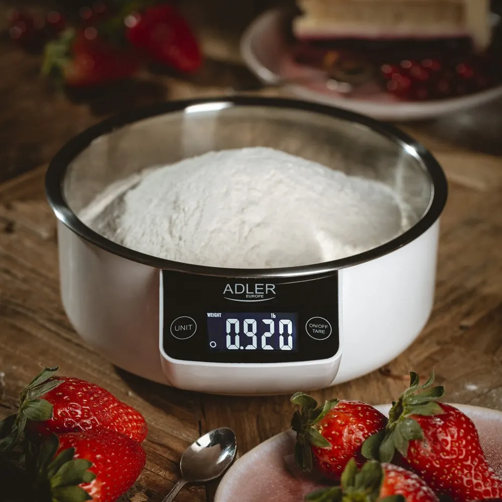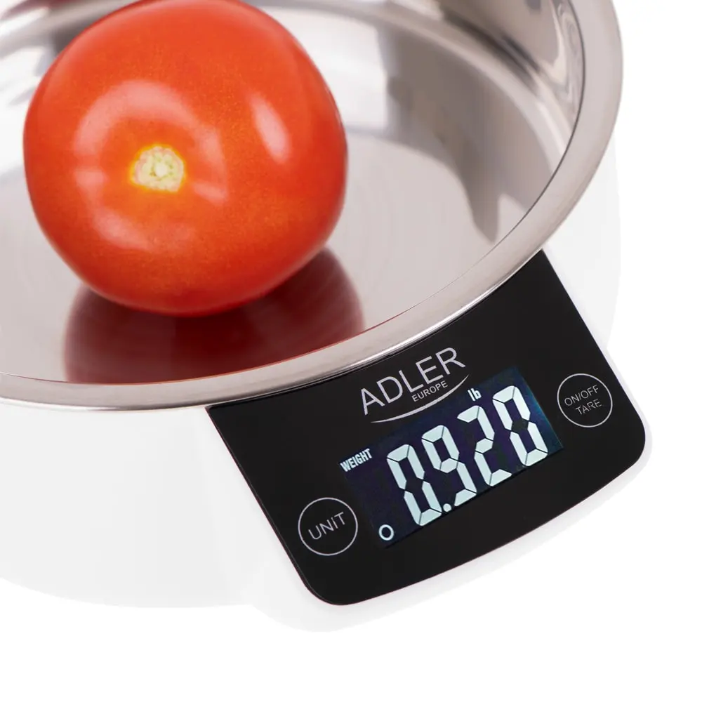 Køkkenvægten har automatisk eller manuel slukning og et tydelilgt display. Skålen i rustfrit stål er let at holde ren. Desuden har vægten mulighed for at beregne volumen af væske, hvilket er anvendeligt hvis man mangler et målebæger.