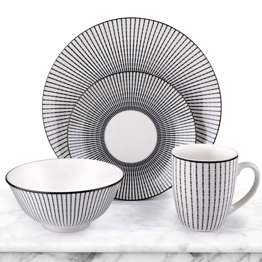 Få ditt kök att skina med Alpinas snygga servis i randigt mönster! Det här är ett 16-delars serveringsset och innehåller det grundläggande för att bjuda in till en härlig middag eller en mysig frukost. Med fyra mattallrikar, fyra desserttallrikar/assietter, fyra skålar och fyra koppar, är det perfekt för en familj på fyra personer. Den eleganta svartvita designen med randigt mönster kommer att imponera på dina gäster och göra varje måltid till en fest. Tack vare materialets hållbarhet är servissetet både tåligt och lätt att rengöra.