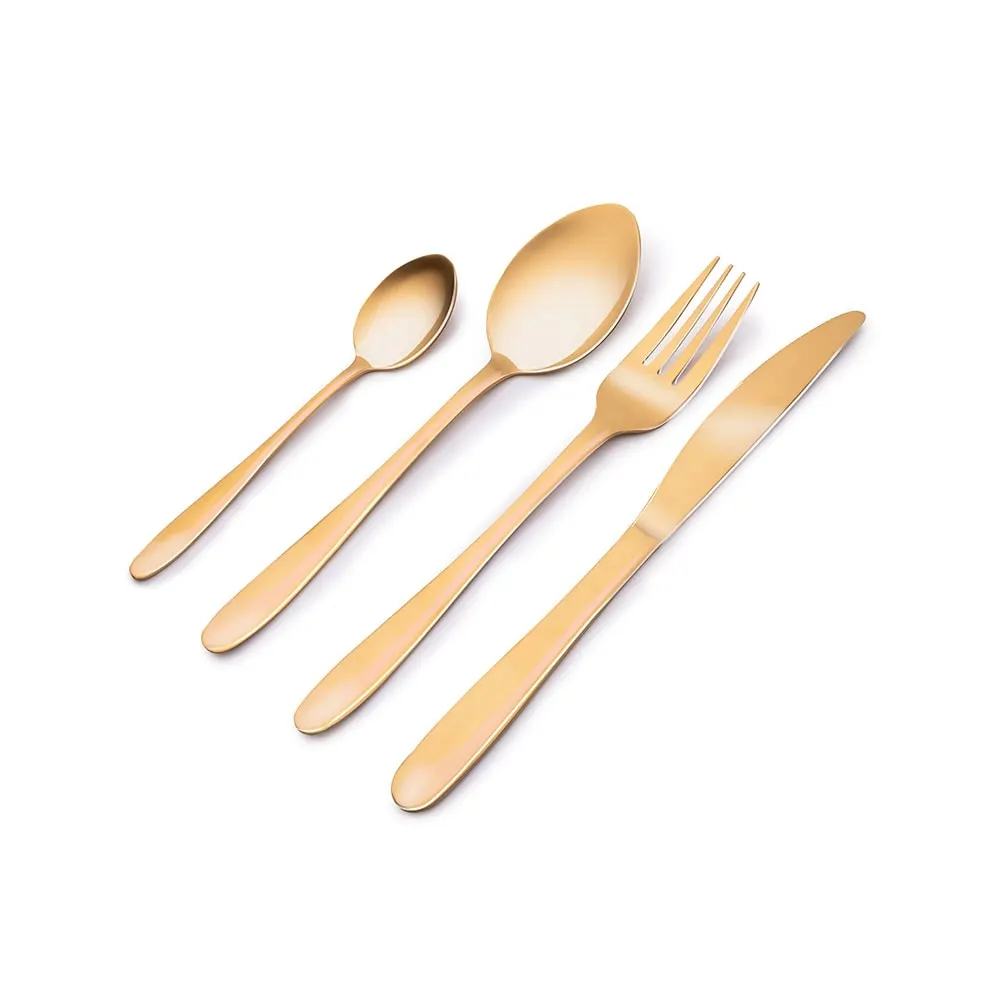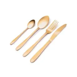 Sæt med guldfarvet bestik fra Alpina der er beregnet til 4 personer. Bestikket består af 4 skeer, 4 gafler, 4 knive og 4 teskeer. Bestikket ligger pakket i en fin æske der gør det til en perfekt gave at give bort.