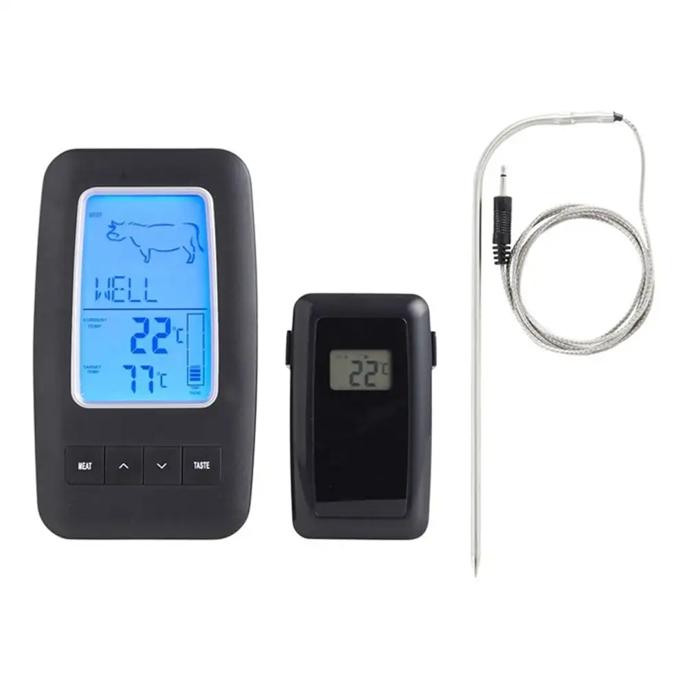 Med dette thermometer får du eksakt check på tilberedningen af kødet eller fisken. Thermometeret er trådløst, og modtageren har en rækkevidde på 60 meter, hvis intet står i vejen. dette indebærer at du kan sidde i solstolen og følge kødets gradvise øgning i temperatur. Det måler mellem 0 og 250 grader C, og har blåt LED-lys på skærmen så den ses tydeligt.