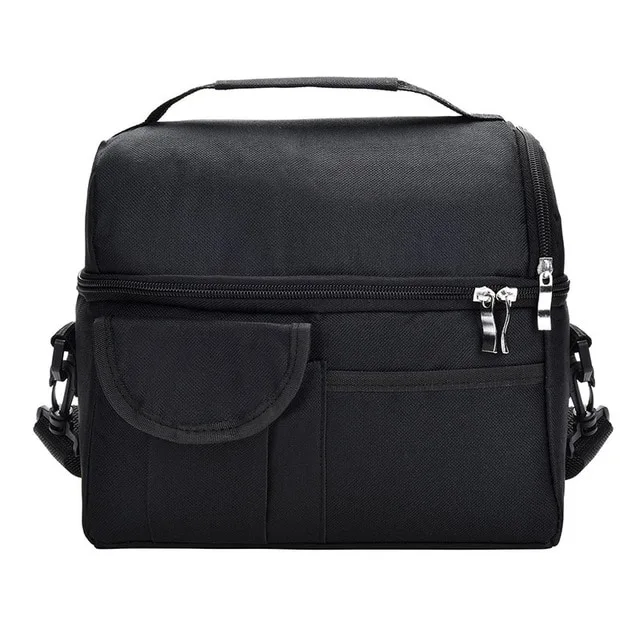 Smidig køle/frokosttaske du kan genbruge, med vandtæt funktion. Sort farve med vandtæt aluminiumsfilm, og med lynlås for den bedste køleeffekt til din mad. Flere rum til opbevaring af forskellige madvarer, med aftagelig funktion på et af rummene. Flere siderum og enkelt håndtag, og der medfølger også en aftagelig, længere rem på tasken.