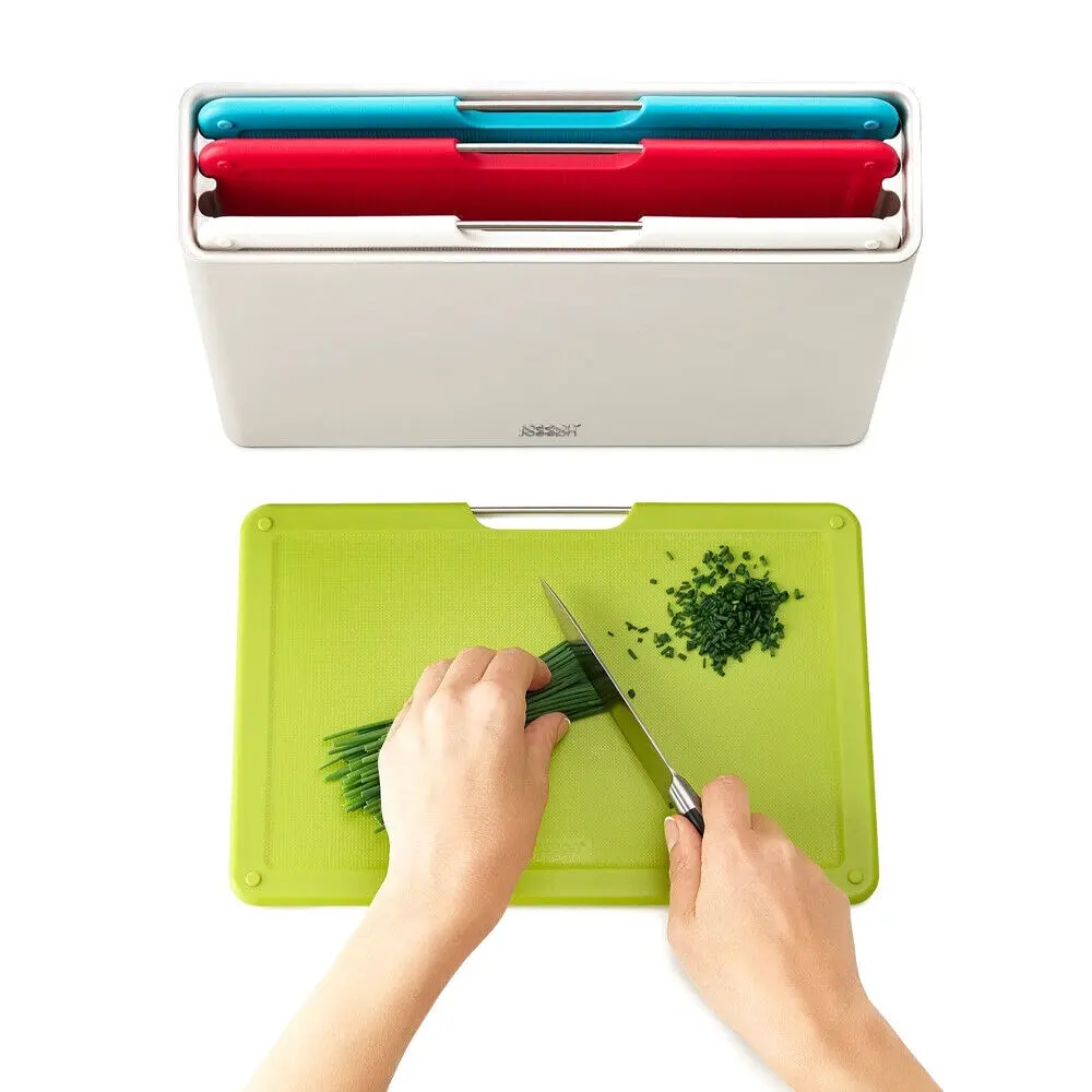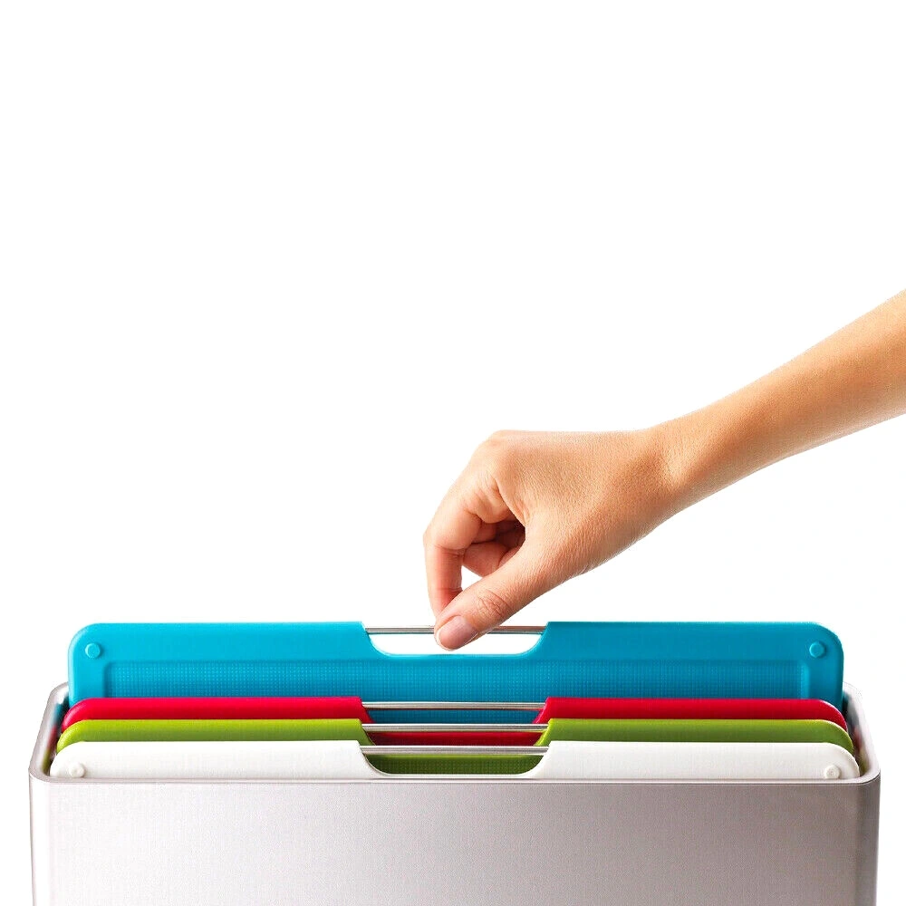 Joseph Joseph Folio skærebrætssæt indehoolder fire skærebrætter og en opbevaringsholder. Skærebrætterne er i forskellige farver og har et gitterhåndtag, hvilket gøør det let at løfte dem ud ad holderen. Brætterne har en skærevenlig overflade og en skridfri base, hvilket gør dem til det perfekte arbejdsredskab ved madlavning.