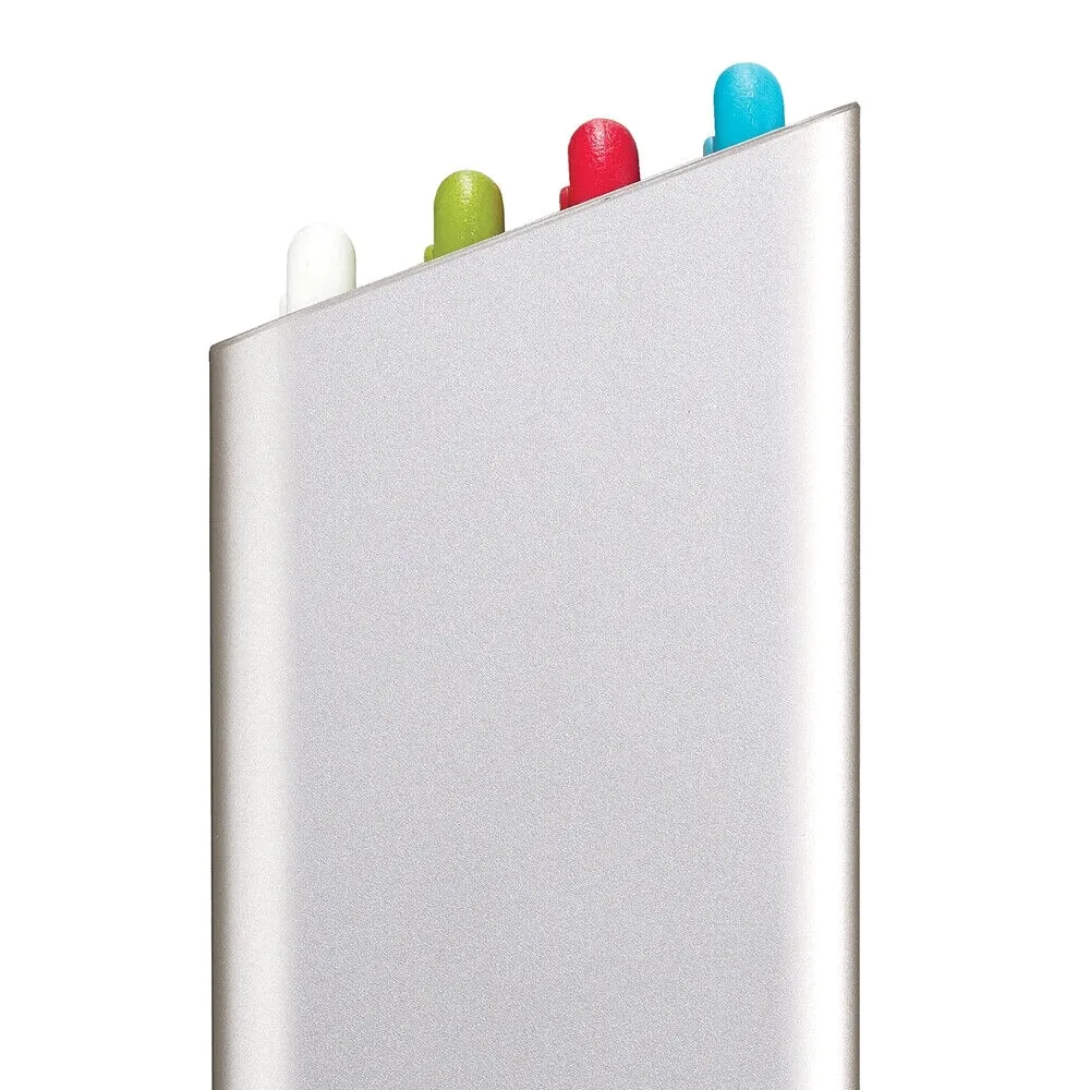 En praktisk og flot opbevaringsholder holder brætterne organiseret og tørrer dem luftigt ved at holde brætterne adskilte fra hinanden. Hvert skærebræt måler 24 x 34 cm, og kan vaskes op i maskine. Den sølvgrå holder ser smuk ud på alle køkkenborde.