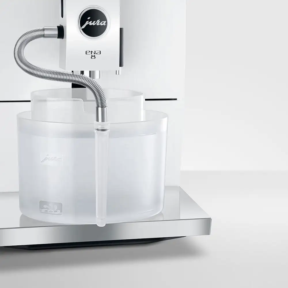 Den är kompatibel med alla listade JURA automatiska kaffemaskiner som nämns och har lätt synliga märken för att indikera hur mycket mjölksystemrengöringsmedel och vatten som ska tillsättas. Dess optimerade form gör den lätt att förvara.