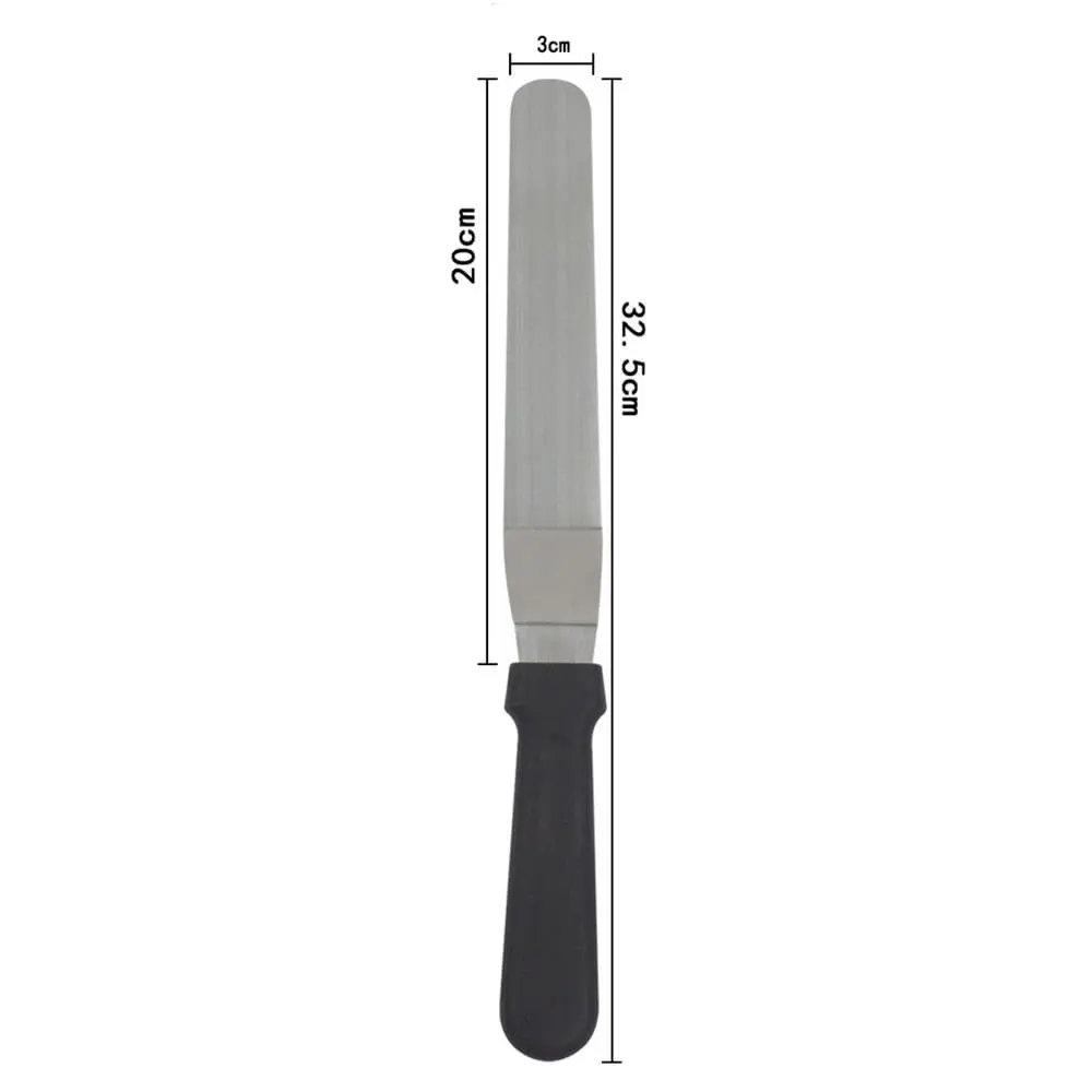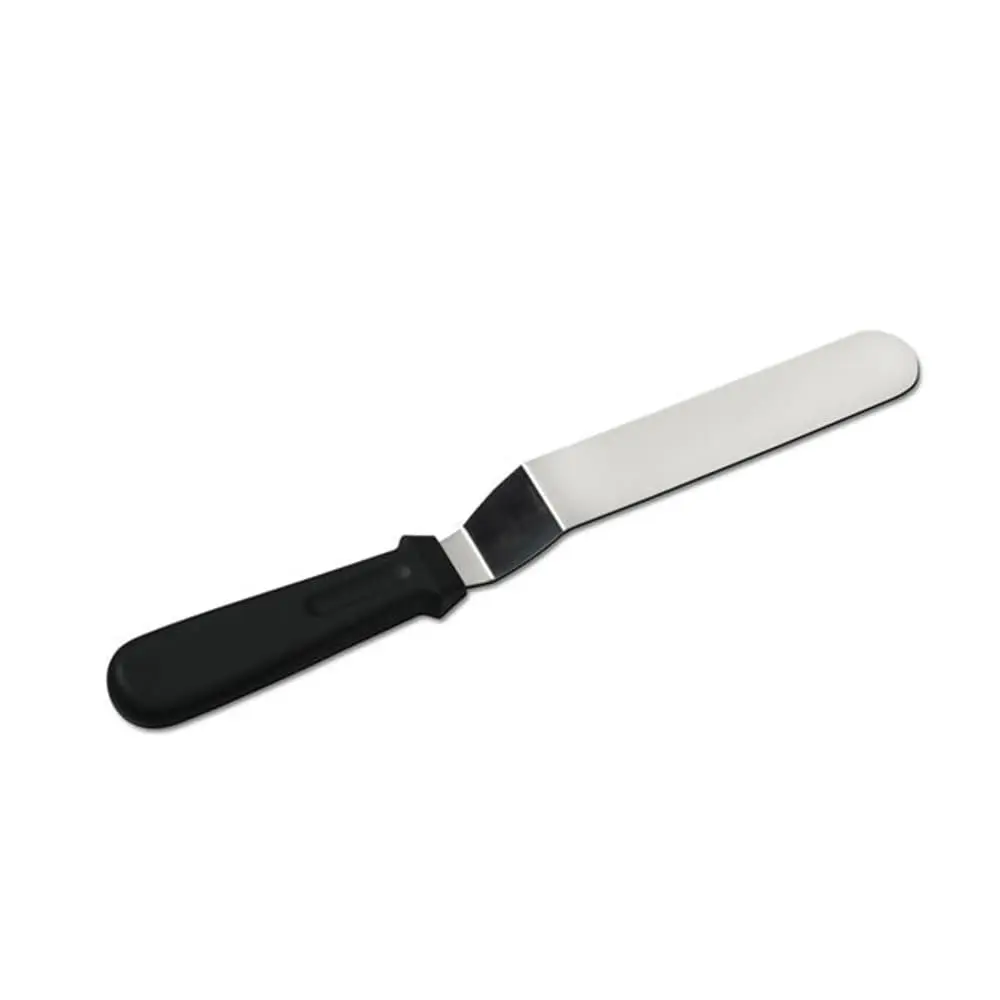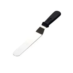 Vinklet kagespade / paletkniv i rustfrit stål for bagning og dekorering af tærter og kager. Perfekt når du skal sprede fyldning eller glasur ud. Takket være det vinklede blad kommer di lettere til, uden at hånden støder ind i bagværket. Paletkniven kan også udmærket anvendes som stegespade.