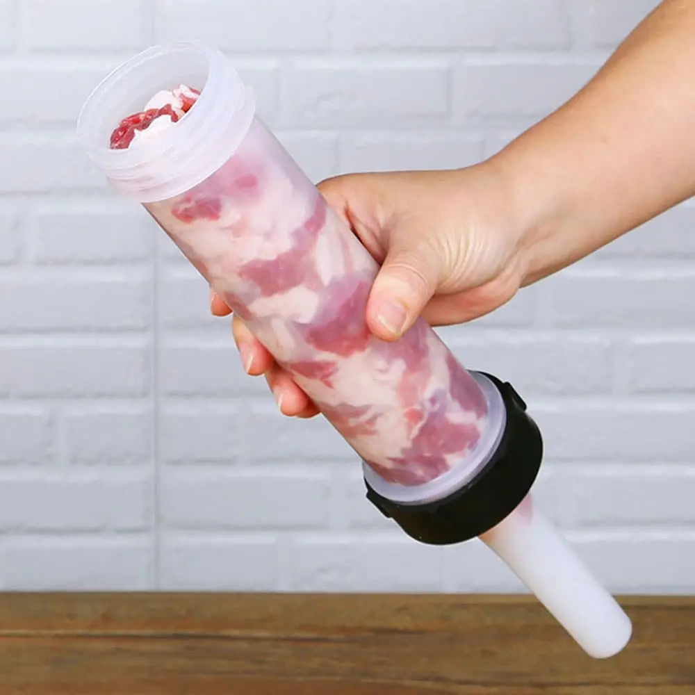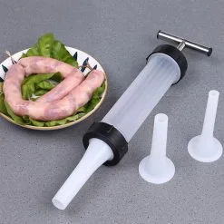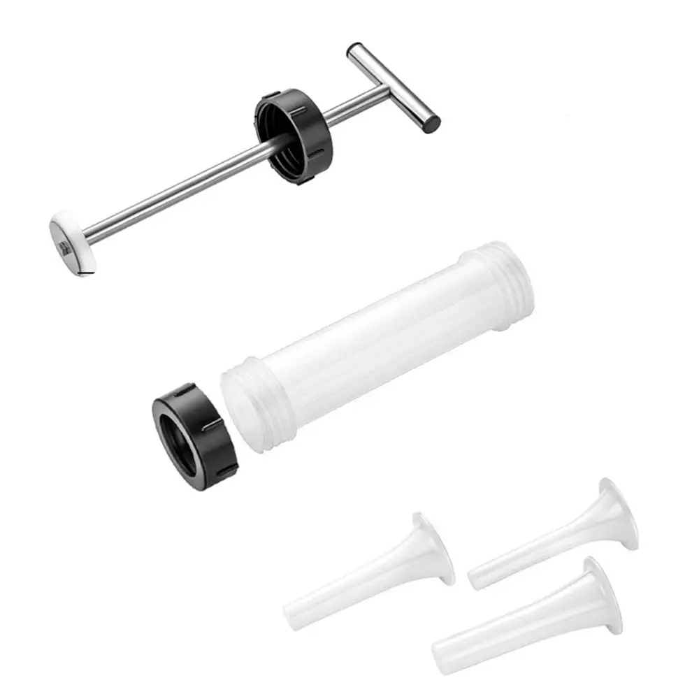 Pølsestopper af rustfrit stål med tre forskellige mundstykker.