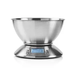 Digital køkkenvægt med indbygget thermometer og vækkeur, vejning af ingredienser op til max fem kilo. Den har en aftagelig, rustfri skål som er let at rengøre.