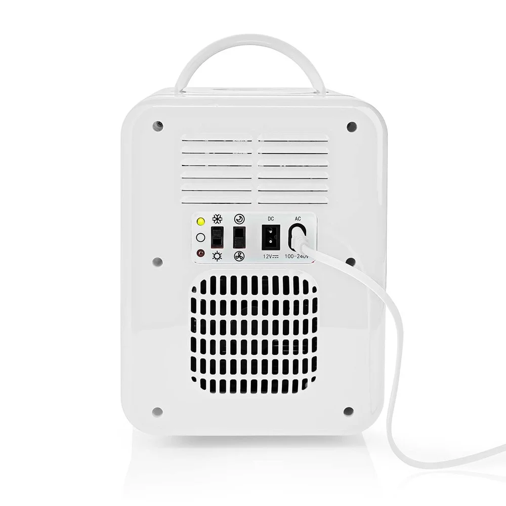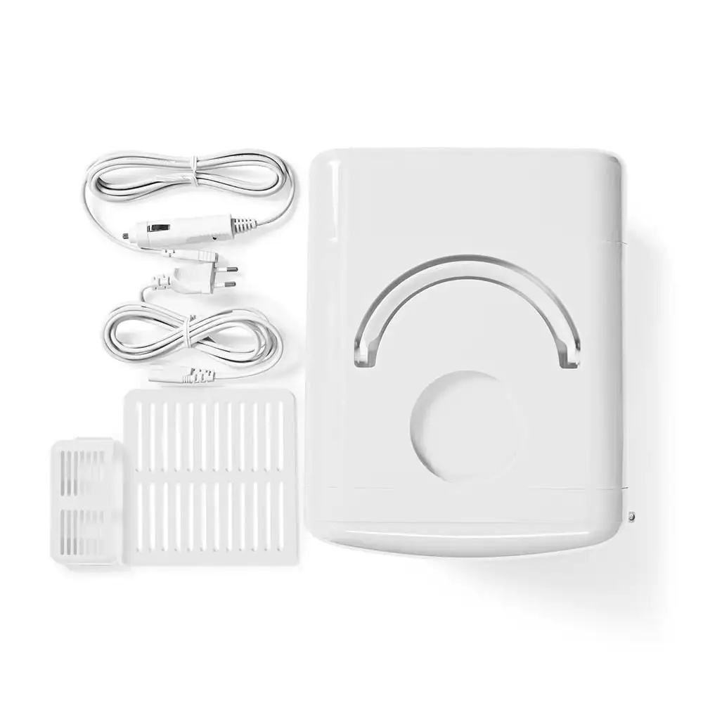 Bærbart, personligt minikøleskab som holder din mad eller drik kold. Du kan let opbevare 6 dåser med drikkevarer i standardstæørrelsen 33 cl. På en aftagelige hylde kan du placere mindre ting som yoghurt, mælk, frugt eller en smoothie. Den kompakte og pladsbesparende konstruktion gør at du kan placere det på trange steder hjemme, i arbejdsværelset eller på kontoret. Eftersom det er let og har et bærehåndtag er det enkelt at tage med sig. Kolde drikke holder si kolde i fere timer efter at det bærbare køleskab er blevet slukket. To strømkabler indgår for både almindelige vægudtag og 12 V-cigarettænderudtag i biler.