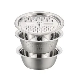 3-i-1 multifunktionelt sæt til køkkenet – det består af tre stk nødvendige køkkentilbehør som kan anvendes både separat og sammen. I sættet indgår et rivejern som enten placeres oven på dørslaget eller skålen. Rivejernet har fire slags udskæringer for at dække alle dine behov i køkkenet, uanset om du behøver at rive kartofler, ost eller grøntsager. Ingredienserne falder direkte ned i beholderen, hvilket modvirker madspild. Takket være sættets udformning er det betydelig lettere at rengøre end et almindeligt rivejern. Som et ekstra plus kan du desuden anvende skålen som bagetilbehør, eller også anvende den sammen med dørslaget for at si overflødig væske fra.